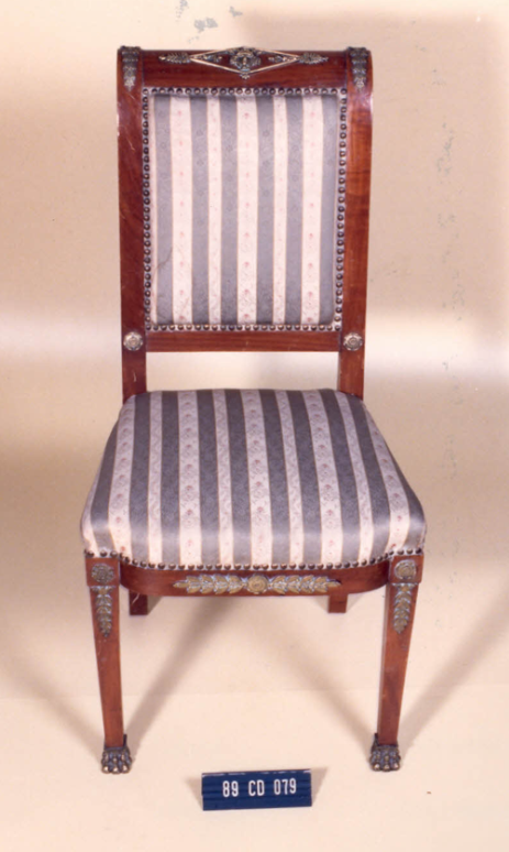 Cadeira estruturada em madeira com estofamento em tecido listrado, espaldar retangular, cachaço reclinado. Ornamentos em ramos com frutos, losango com elementos fitormorfos, centrando máscara antropomorfa (superior) e rosáceas (inferior). Assento curvo, frente ornada em rosáceas e ramos com frutos. Pernas dianteiras de secção quadrangular ornadas por ramos com frutos. Pernas traseiras curvas. Pés em garra […]