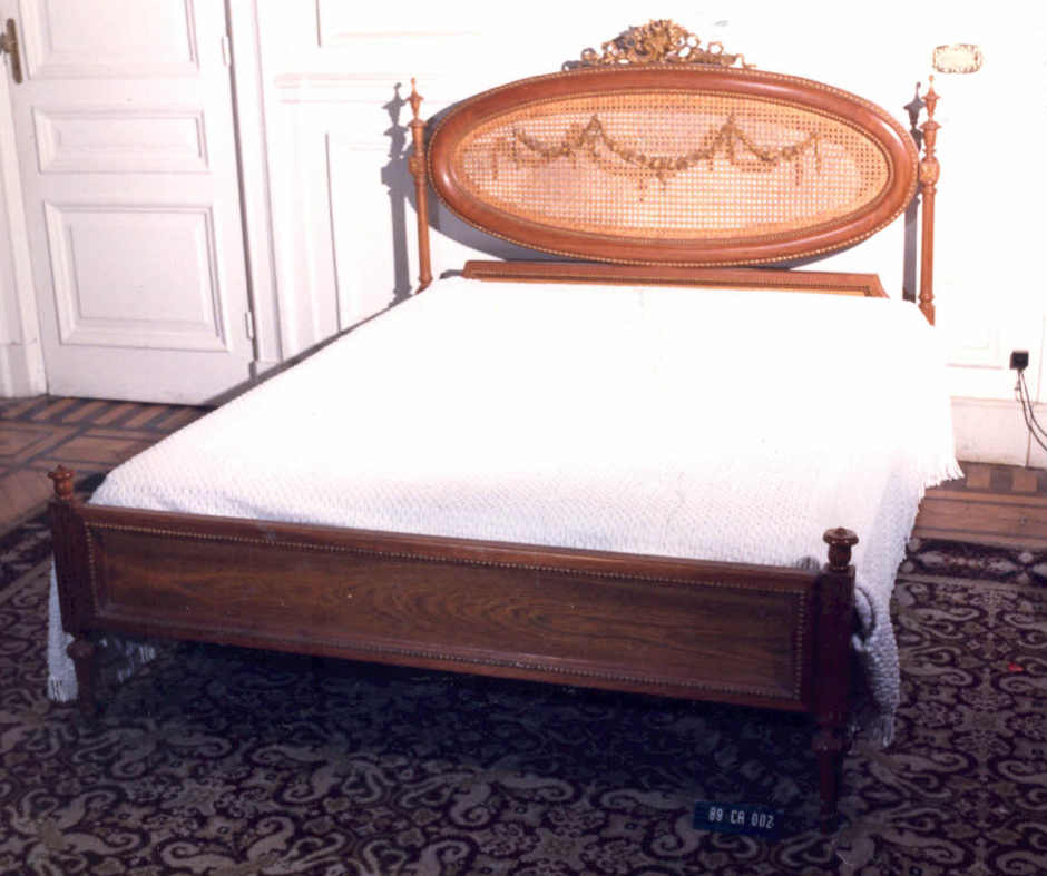 Cama de casal, de forma retangular, com cabeceira alta de forma elíptica, contornada por friso perolado(interno) e friso retorcido(externo) arremate superior feito por ornamento vazado em laços, flores, acantos e folhagens. Centro em palhinha com festões de flores, cortinados e folhas. Parte inferior em friso perolado. Laterais marcadas por coluna com caneluras, arrematadas por cubo […]