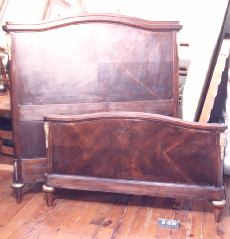 Cama com cabeçeiras retangulares, com parte superior arqueada; quinas marcadas por apliques com elementos fitomorfos, perolados, volutas e elementos emodilhados. Pés cônicos, com nó superior revestido por anel metálico.