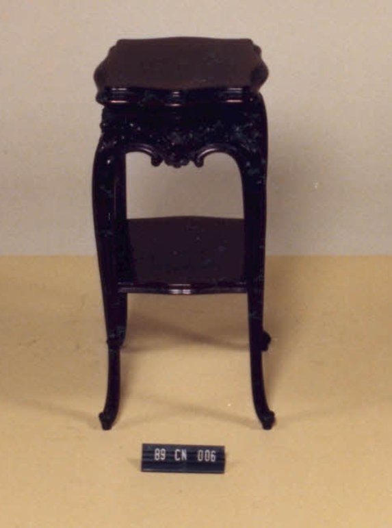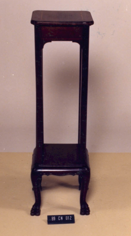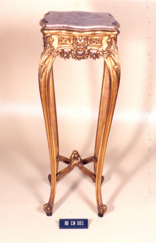Cantoneira com tampo quadrangular, borda em curvas e contra-curvas. Aba reoortada em curvas, ornada por plumagem rococó, com flores, frisos em C e S e rocalhas. As quinas são marcadas por acantos que descem até as pernas. Pernas com joelheiras suaves frisadas, recurvadas inferiormente onde são arrematadas por duas volutas. Pés em sapata. Ao centro, […]