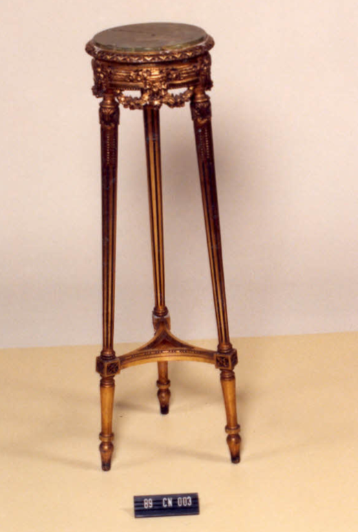 Cantoneira com tampo circular em ônix verde, borda ornadas por elementos fitornorfos, lanceolados, aba contornada por fitas com flores e friso perolado. Da parte inferior caem festões de flores. Junto às pernas observa-se retângulo com folhas e frutos redondos. Pernas cilíndricas, com caneluras, arremate superior em acantos e perolados. Terço inferior em cubos com flores […]