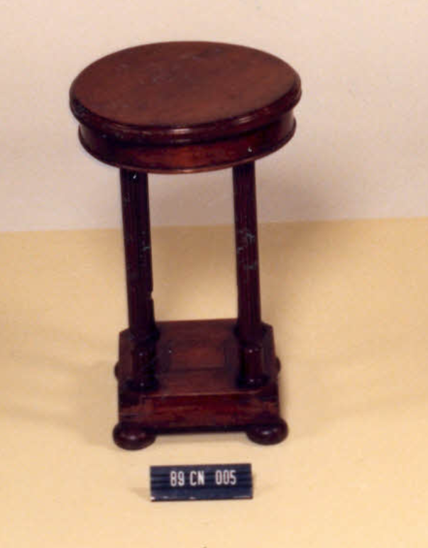 Cantoneira com tampo circular de borda emoldurada. Pernas cilíndricas em caneluras, arremate inferior em elemento campaniforme, base quadrangular, quinas chanfradas pés em bolachas.