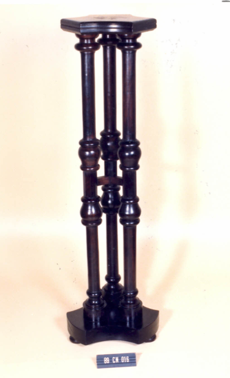 Cantoneira com tampo hexagonal, em três partes côncavas e três retas; sustentação por três colunas cilindricas, arrematadas em bolachas inferiores e superiores. Ao centro par de bolachas esféricas e nós, elementos oitavados unidos por um Y. Base hexagonal, seguindo mesma linha do tampo, e pés embolachas.