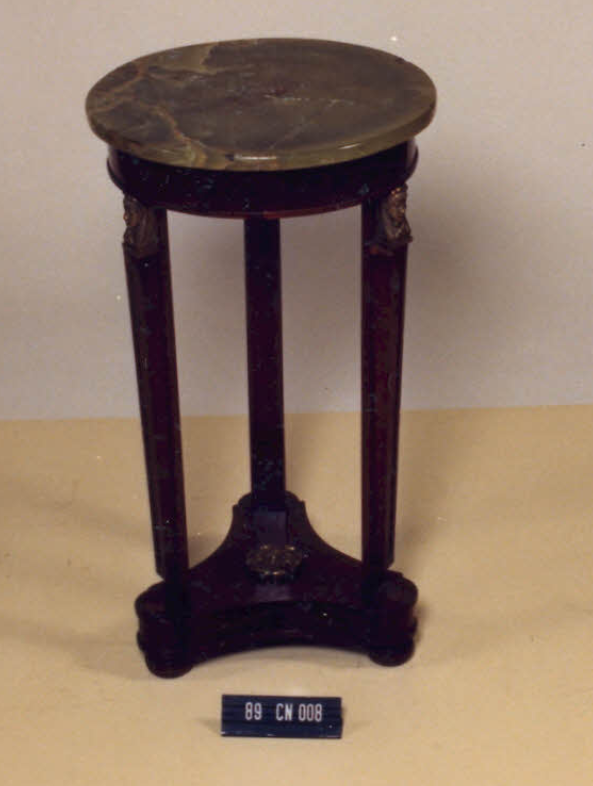 Cantoneira circular, com tampo em ônix verde. Três pernas de secção quadrangular, ornadas por bustos egipcios na parte supeiror. Base trilobada, com pés embolacha.