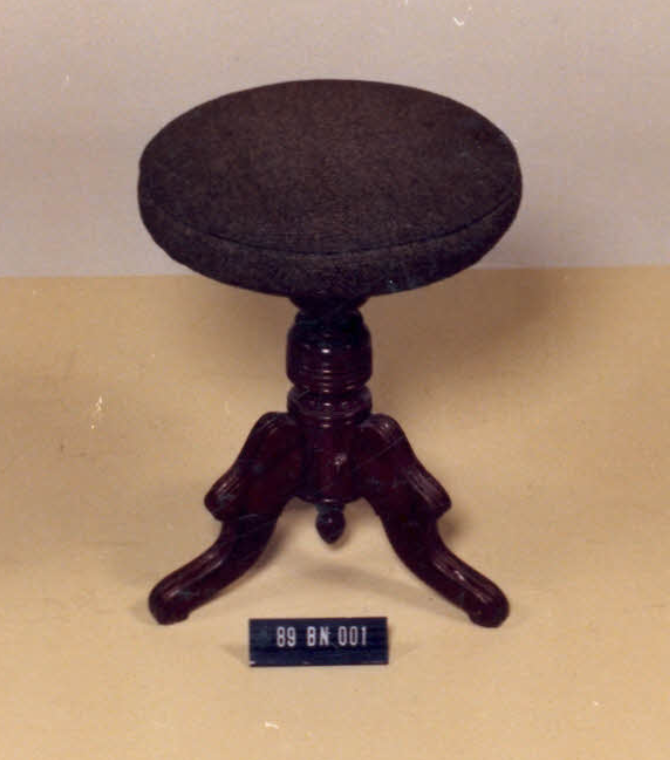 Banco de assento circular, enroscável. Coluna torneada em frisos, arrematado inferiormente por pinaculo. Três pés recortados em curvas e contra-curvas, em frisos.
