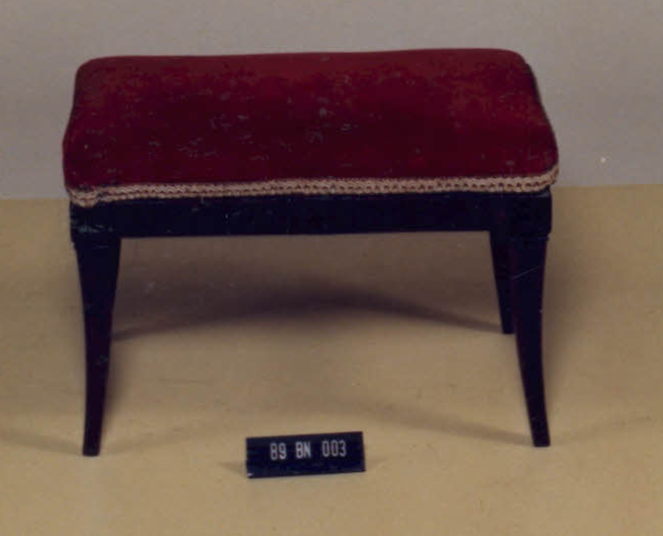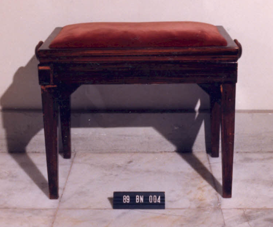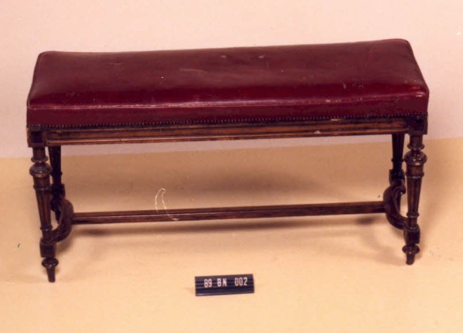 Banco retangular, com assento em veludo vermelho. Pernas de secção quadrangular, com roscas para regular altura do assento.