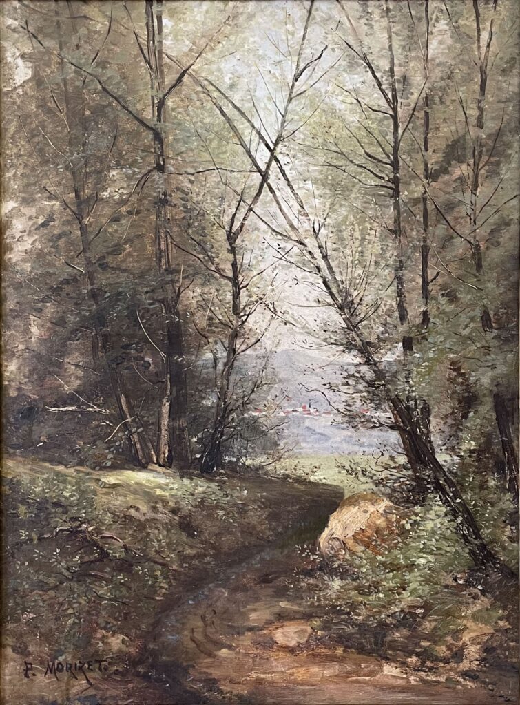 Pintura figurativa com paisagem mostrando caminho entre grandes árvores no primeiro plano. Ao fundo aparece pequena cidade cercada por montanha e parte do ceu. Moldura retangular com friso exterior em fIores, elementos fitomorfos e elementos curvos, friso interior, em pequenas flores, circulares interligado por cordas. Passe-partont liso.