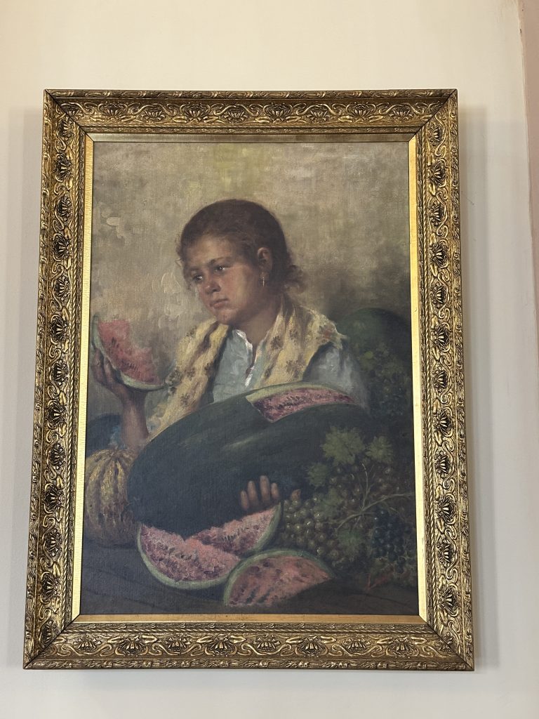 Pintura representando figura feminina, bem jovem, posição quase de perfil, cabelos amarrados atrás da orelha, com brinco. Está no meio de melancias e uvas. Tem à mão direita uma fatia de melancia e na mão esquerda segura uma melancia com uma parte fatiada. Veste vestido azul e chale amarelo. Moldura retangular, dourada, ornada em barragem […]