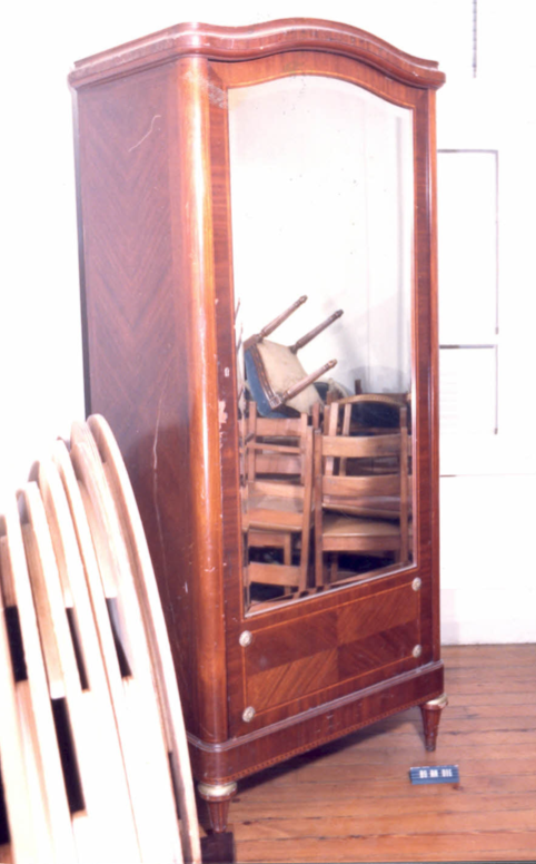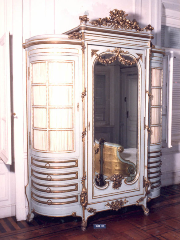 Móvel retangular, porta central espelhada; laterais curvas com portas envidraçadas e gavetas. Arremate superior em forma de frontão, com cesto de flores, espiga e reta cruzados, festôes e laços; cimalha em frisos, emoldurada em frisos de contas que se prolongam nas laterais. Porta central retangular com vidro em moldura oval, contornada por friso de contas; […]