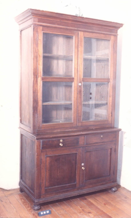 Móvel retangular, com cimalha superior, centro com porta em duas folhas, em duas partes de vidro. Parte inferior com duas gavetas e porta de duas folha em almofada quadrangular. Base emoldurada, com pés esféricos frisados.