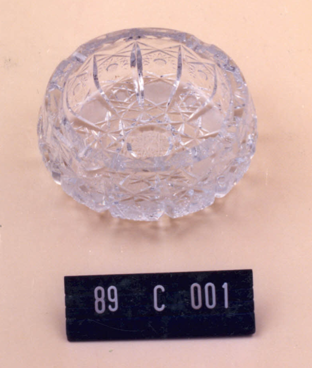 Cinzeiro circular lapidado com losângulos, triângulos e estrelas.